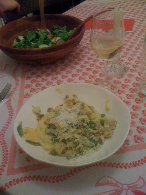 This is sort of a cheater's version of a very springy polenta, since it relies on frozen peas and canned artichoke hearts. If you have the inclination to go the natural route with these, I'm sure it would be amazing! It's pretty great as is, though.